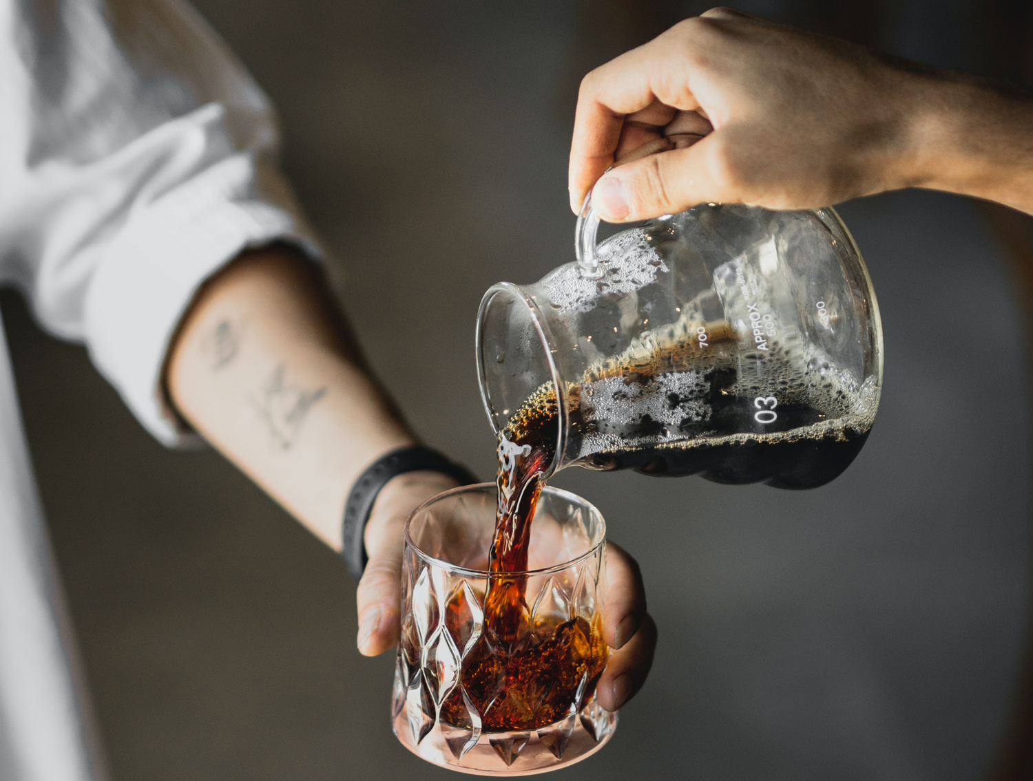 Pour the first 100ml of water within 15 seconds and give it a nice swirl. When the water has drawn down by 1 minute, pour the next 100ml, and then the last 100ml by 2 minutes. The total brewing time should be 3 minutes. If it takes longer or shorter, adjust the grind size accordingly.
