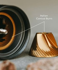The AeroPress Manual Coffee Grinder features a compact, all-metal design that fits entirely inside an AeroPress plunger for portability. It uses Italian-made titanium-coated stainless steel conical burrs to produce consistent grinds with minimal heat buildup. The grinder offers more than 60 adjustable settings, ranging from fine for espresso to coarse for French press, with a factory default of medium-fine optimized for AeroPress brewing. It has a capacity of up to 25 grams of beans, suitable for single or double servings.