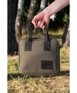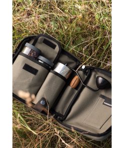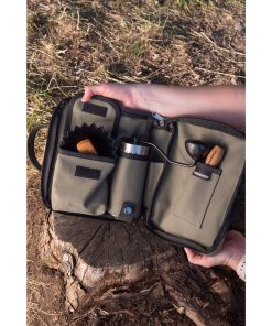 The Travel Bag XL Forest is a compact, handmade carrying case designed for transporting manual coffee grinders and related accessories, such as the Comandante C40 series. It features customizable internal pockets for organizing items like grinders, bean jars, or small tools, with padded main panels to protect contents during travel. The bag is constructed from robust cotton canvas for both the interior and exterior, complemented by premium Italian oil pull-up leather straps and a durable YKK zipper for secure closure and comfortable handling.