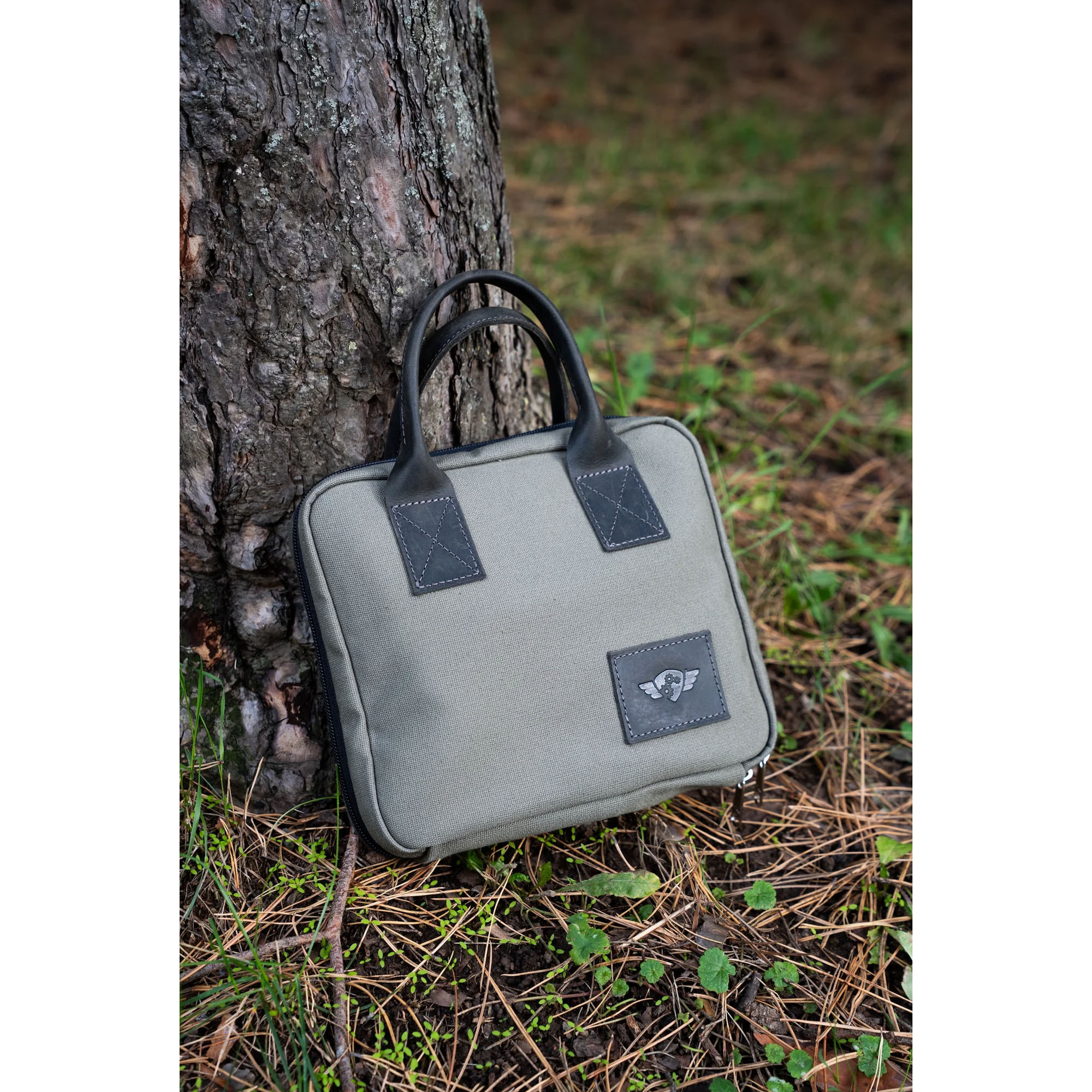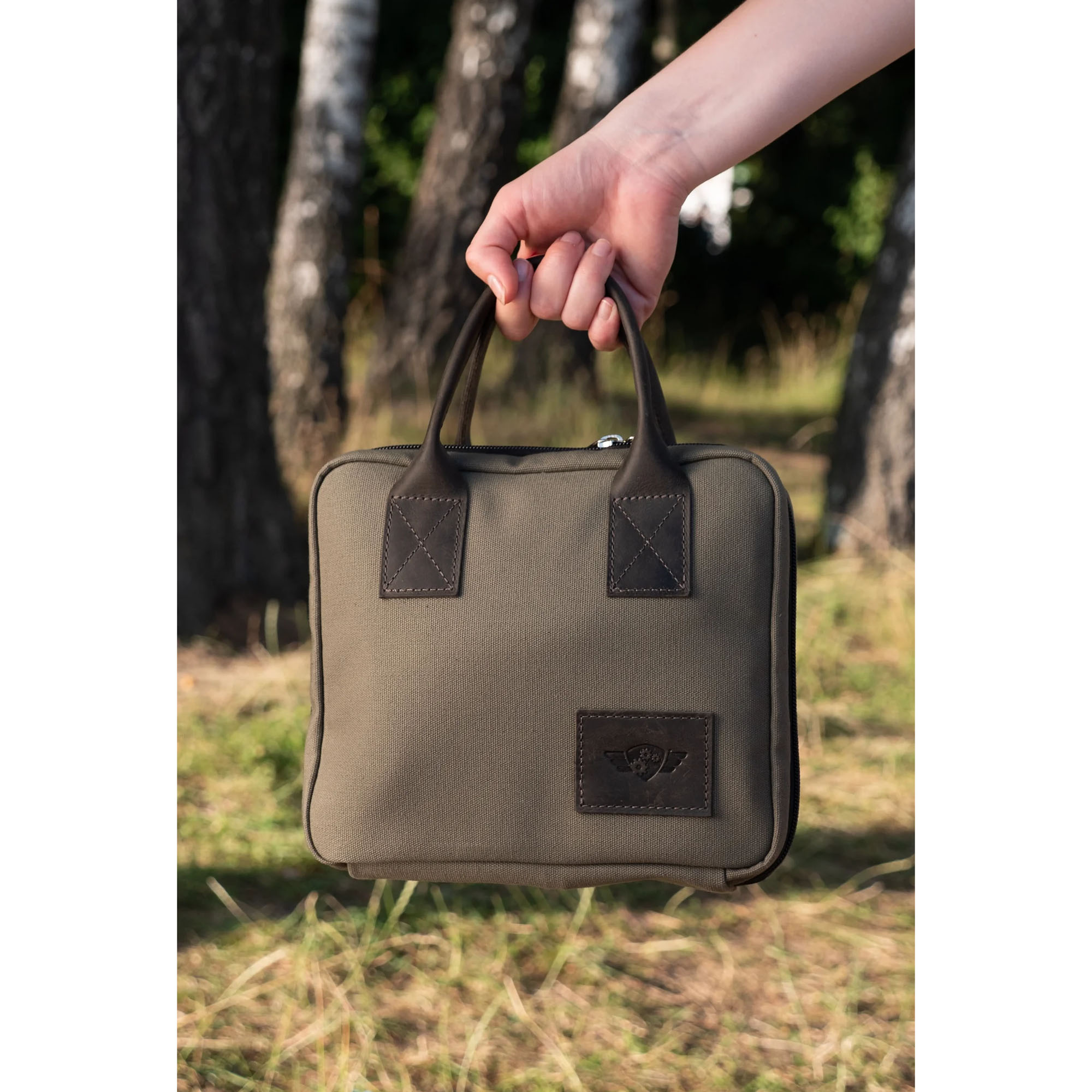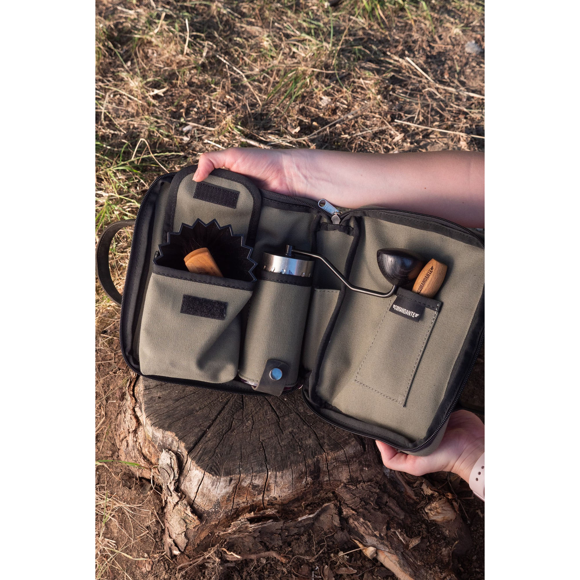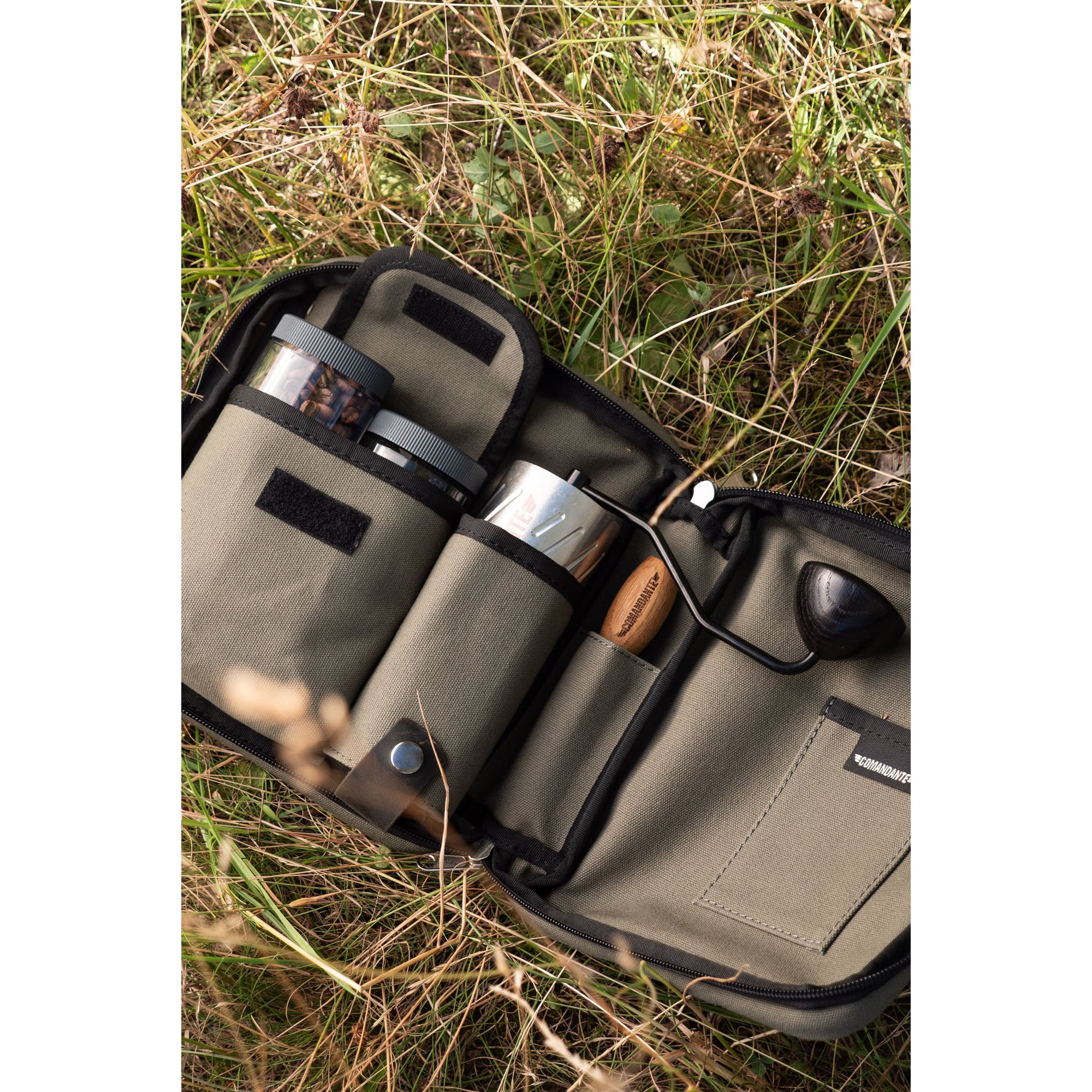 The Travel Bag XL Forest is a compact, handmade carrying case designed for transporting manual coffee grinders and related accessories, such as the Comandante C40 series. It features customizable internal pockets for organizing items like grinders, bean jars, or small tools, with padded main panels to protect contents during travel. The bag is constructed from robust cotton canvas for both the interior and exterior, complemented by premium Italian oil pull-up leather straps and a durable YKK zipper for secure closure and comfortable handling.