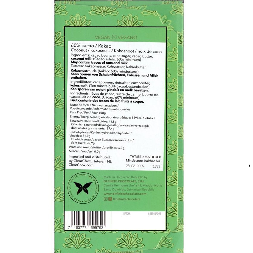 Ingredients: cocoa beans (60%), cane sugar, cocoa butter, coconut milk.