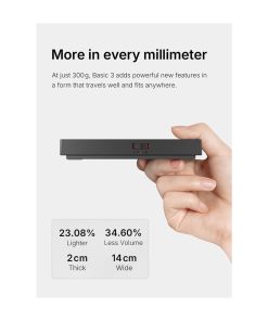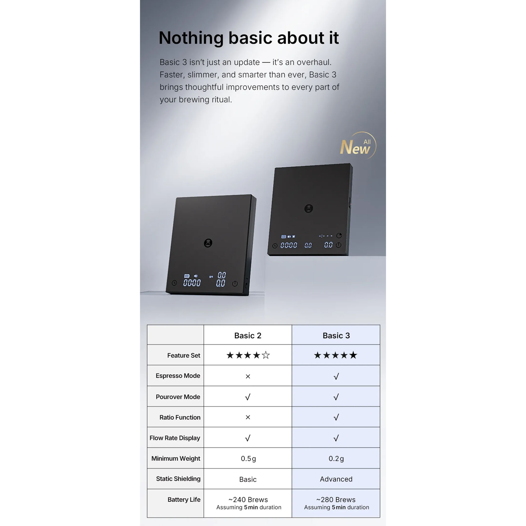 Compared to the Basic 2, the Basic 3 reads accurately from 0.2 g instead of 0.5 g, adds the live ratio display, and is roughly 35% thinner. It also includes an electromagnetic shield in the chassis, which keeps readings stable when the scale sits on a machine’s drip tray or near magnetic catch cups, a common pain point with cheaper espresso scales.