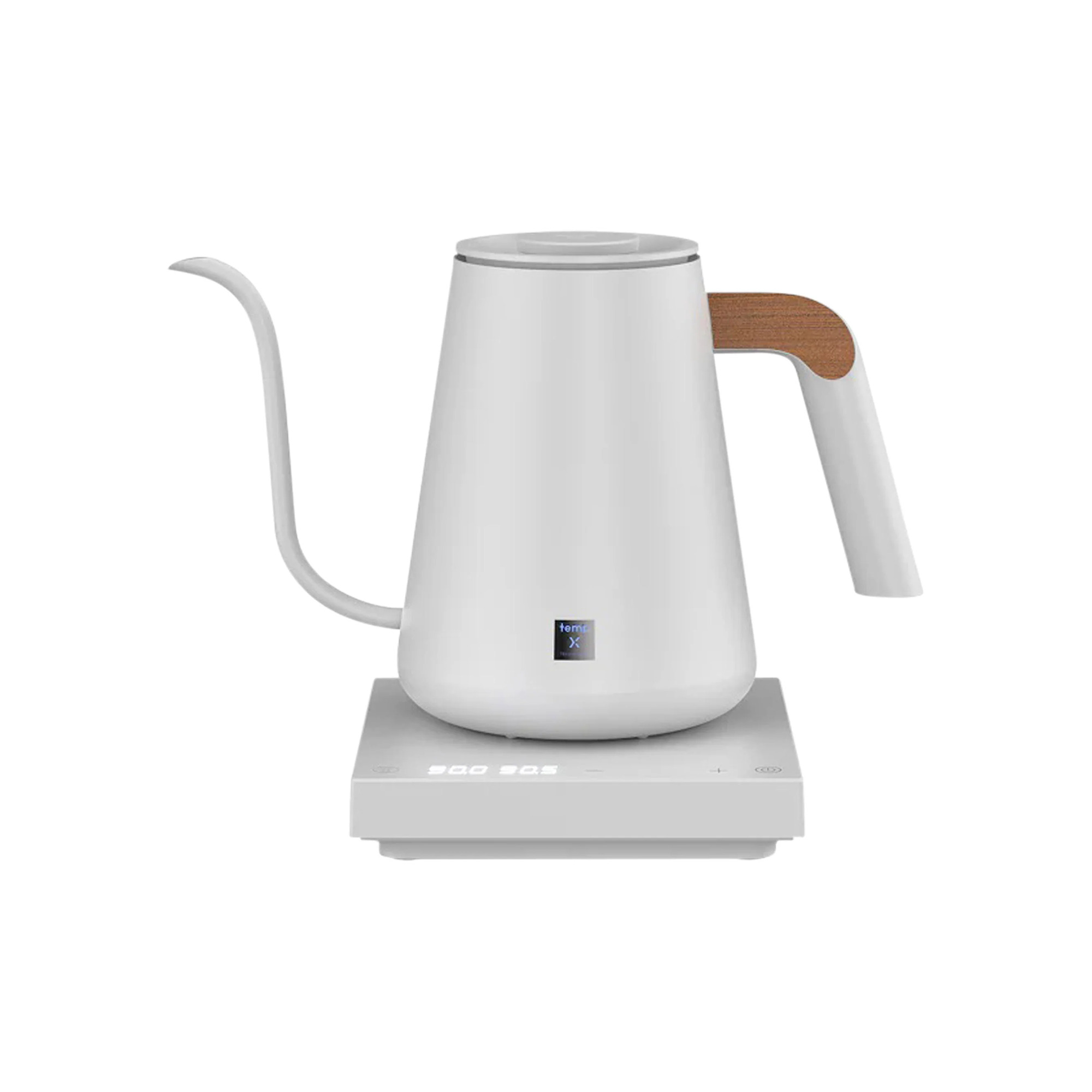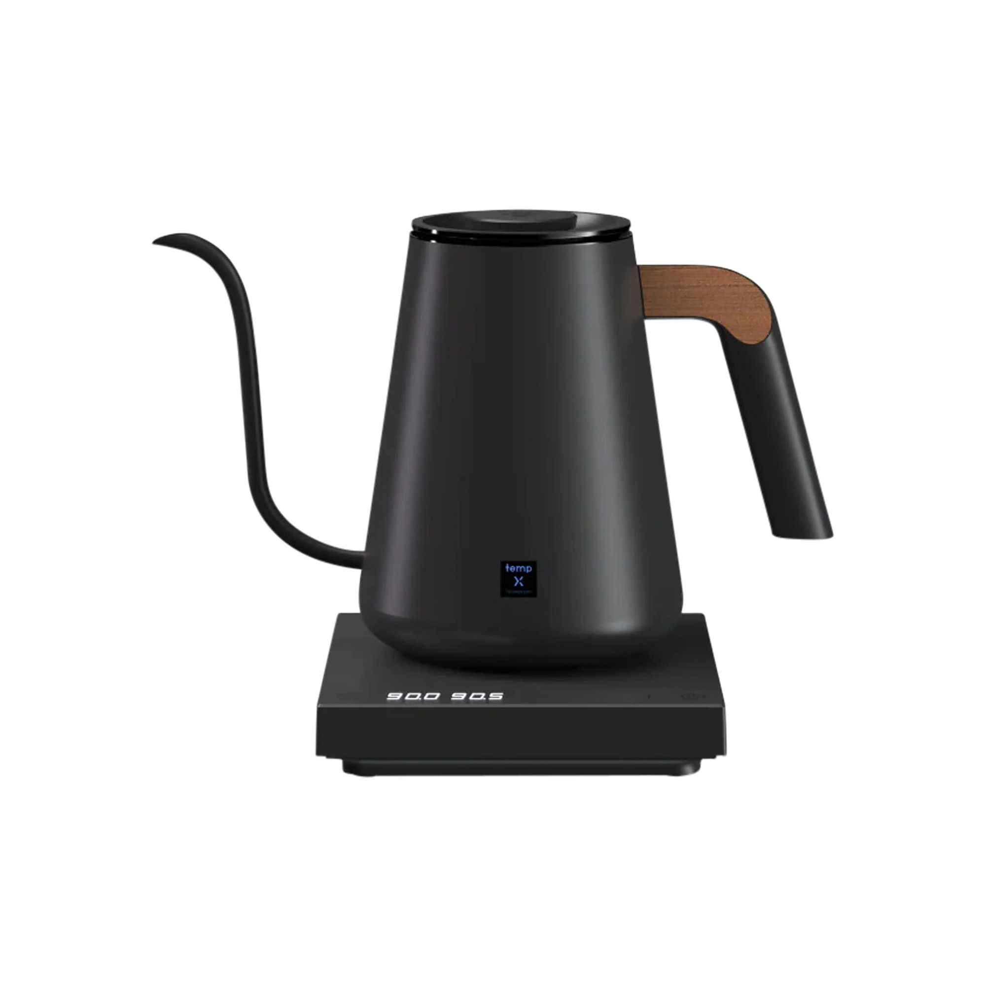 A 900 ml electric gooseneck kettle for pour-over coffee, with ±0.5 °C temperature accuracy and a 40 to 100 °C range. The temp X control system adjusts power to water volume and altitude, and a Grooveboard touch slider with +/- keys handles fine temperature changes. 304 stainless steel interior, wooden thumb rest on the handle.